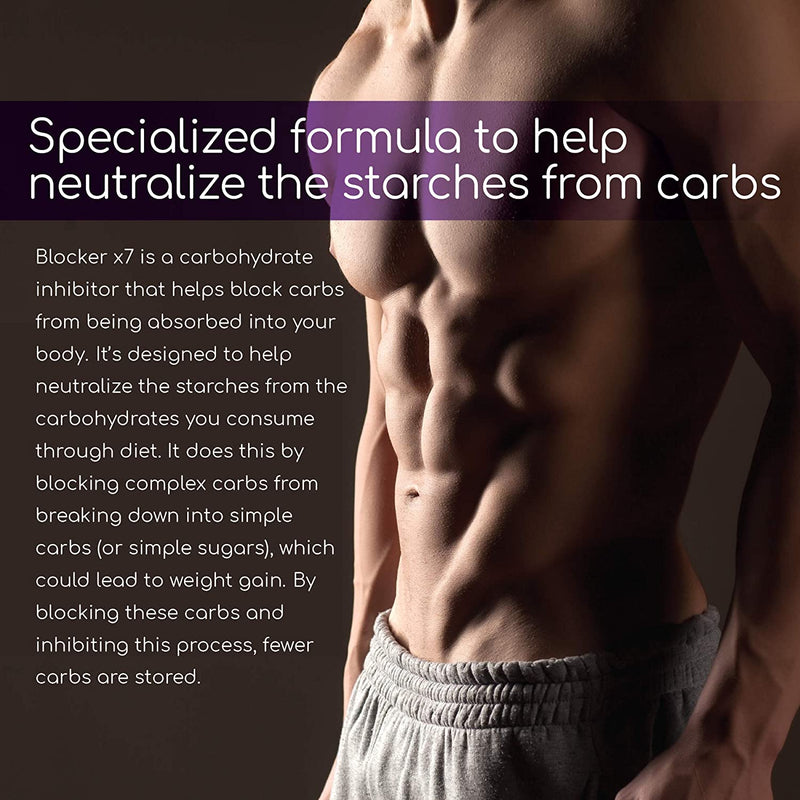 Blocker x7 is a carbohydrate inhibitor that helps block carbs from being absorbed into your body. It’s designed to help neutralize the starches from the carbohydrates you consume through diet. It does this by blocking complex carbs from breaking down into simple carbs (or simple sugars), which could lead to weight gain. By blocking these carbs and inhibiting this process, fewer carbs as a result are stored.∆