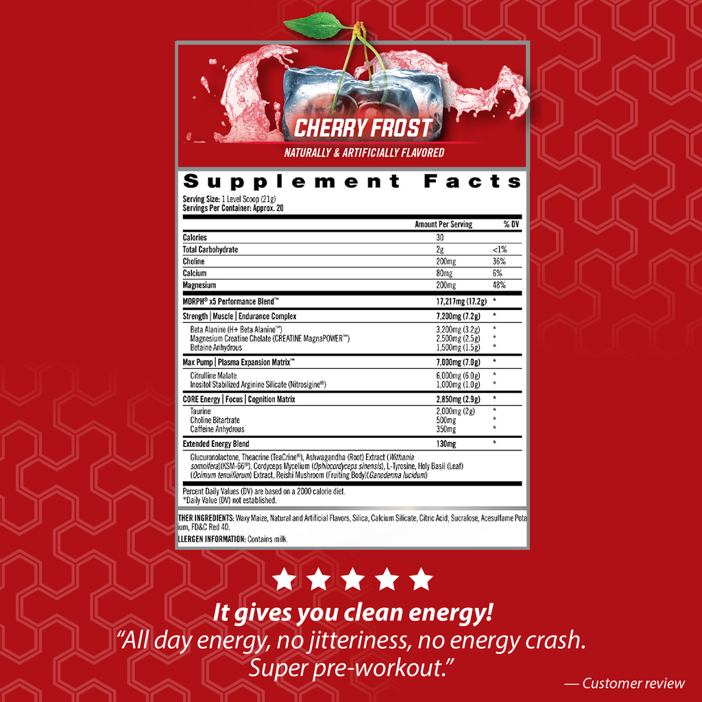 MORPH X5® is my favorite pre-workout and has been since its debut. It's been my most consistent pre- that I use, and that's because I have never grown tolerance to it. I have never had to take more than 1 scoop, and I still get the same effects from using it as I did the 1st time I tried it. Just an all-around excellent pre-workout for focus, pump, and energy.
